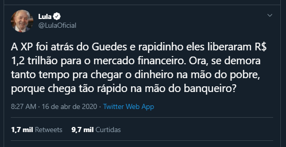 É … BOA PERGUNTA. PORQUE NÃO USAM O MESMO ESQUEMA PARA EFETUAR O PAGAMENTO DOS R$ 600,00 REAIS PARA OS TRABALHADORES ?. ——– POR FALAR EM XP, O HULCK, DONO DO CALDEIRÃO, ATÉ A POUCO TEMPO FAZIA PROPAGANDA DA XP. QUANDO EU ESTAVA ASSISTINDO VÍDEOS NO YOUTUBE, SEMPRE APARECIA A PROPAGANDA . PARECE QUE, DEPOIS QUE A EMPRESA COMEÇOU A SER INVESTIGADA NOS EUA, A PROPAGANDA FOI RETIRADA. ———- LEMBRAM-SE QUANDO OS COXINHAS ACUSAVAM LULA E O PT DE USAREM DINHEIRO PÚBLICO PARA AJUDAR CUBA E A VENEZUELA ?. DEPOIS DA AUDITORIA FEITA NO BNDES, A PEDIDO DO MITO, QUE DIZIA QUE IRIA ABRIR A CAIXA PRETA DO BNDES, NADA SE ENCONTROU. MAS QUANTOS COXINHAS SEGUIDORES DE MITOS E PATOS FICARAM SABENDO DISSO ?. A MÍDIA GOLPISTA DIVULGOU ?. NÃO. É ÓBVIO QUE NÃO. E VAI DIVULGAR ESSE ESCÂNDALO COMO O DINHEIRO PÚBLICO ?. EU ACHO QUE NÃO. OS BANQUEIROS QUE ANUNCIAM NA MÍDIA GOLPISTA NÃO IRIAM GOSTAR, NÉNÃO, COXINHA ?. MAS VOCÊ NÃO VAI BATER PANELA CONTRA ISSO. EU AAAAAAAAAAAAPOSTO QUE NÃO.